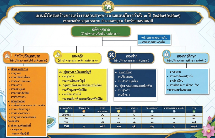 เทศบาลตำบลกุดประทาย ได้จัดทำข้อมูลผังโครงสร้างหน่วยงาน เทศบาลตำบลกุดประทาย อำเภอเดชอุดม จังหวัดอุบลราชธานี เพื่อประชาสัมพันธ์ ให้ความรู้ แก่ผู้สนใจ จึงประชาสัมพันธ์มาเพื่อทราบโดยทั่วกัน