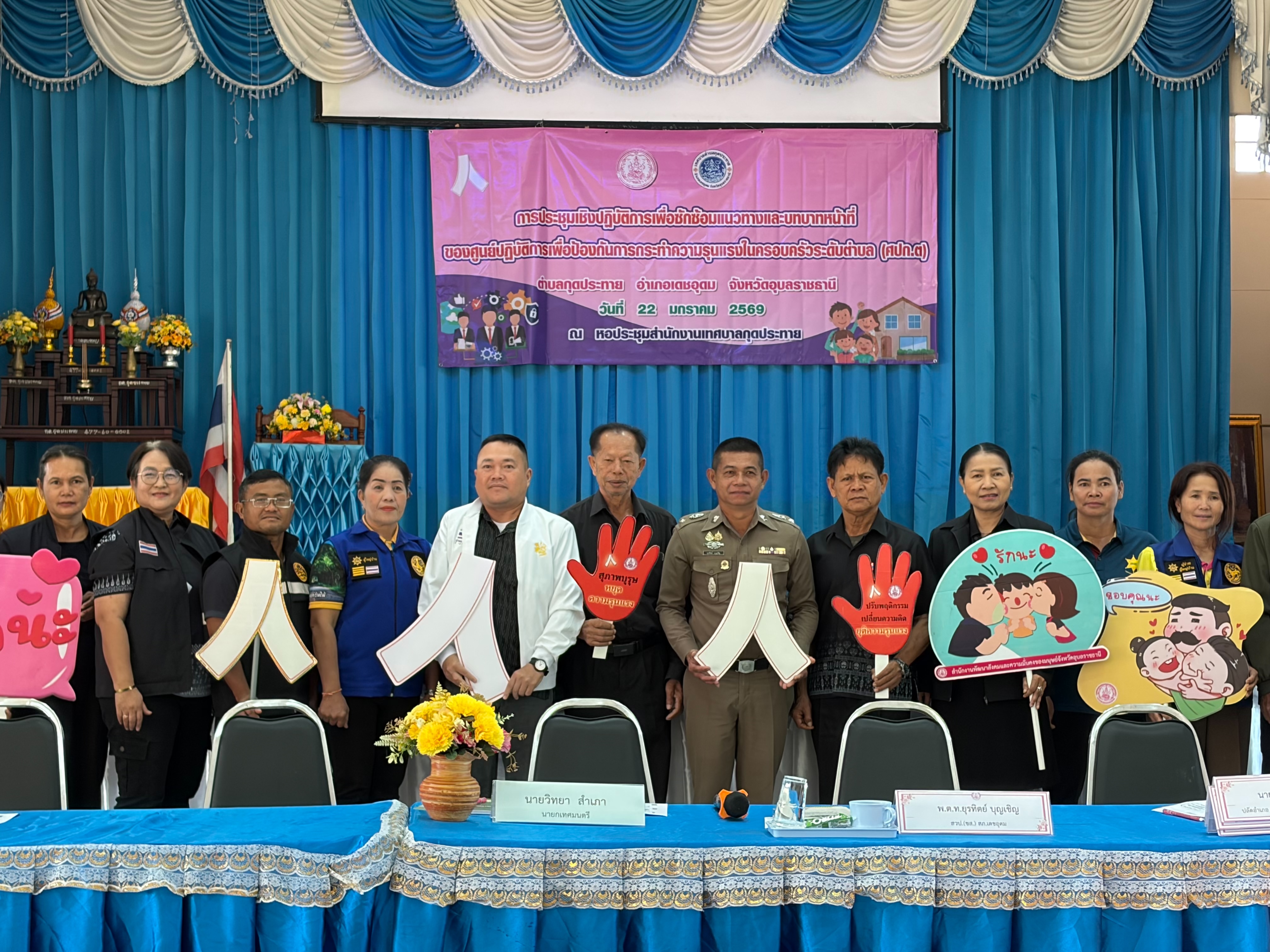 วันพฤหัสบดี, 22 มกราคม 2569 16:30#วันพฤหัสบดีที่ 22 มกราคม พ.ศ.2569 เวลา 09:00 น. #เทศบาลตำบลกุดประทาย โดย นายวิทยา สำเภา นายกเทศมนตรีตำบลกุดประทาย ให้เกียรติเป็นประธานการประชุมเชิงปฏบัติการเพื่อซักซ้อมแนวทางและบทบาทหน้าที่ของศูนย์ปฏิบัติการเพื่อป้องกันการกระทำความรุนแรงในครอบครัวระดับตำบล (ศปก.ต.) ตำบลกุดประทาย อำเภอเดชอุดม จังหวัดอุบลราชธานี ณ อาคารหอประชุมเทศบาลตำบลกุดประทาย